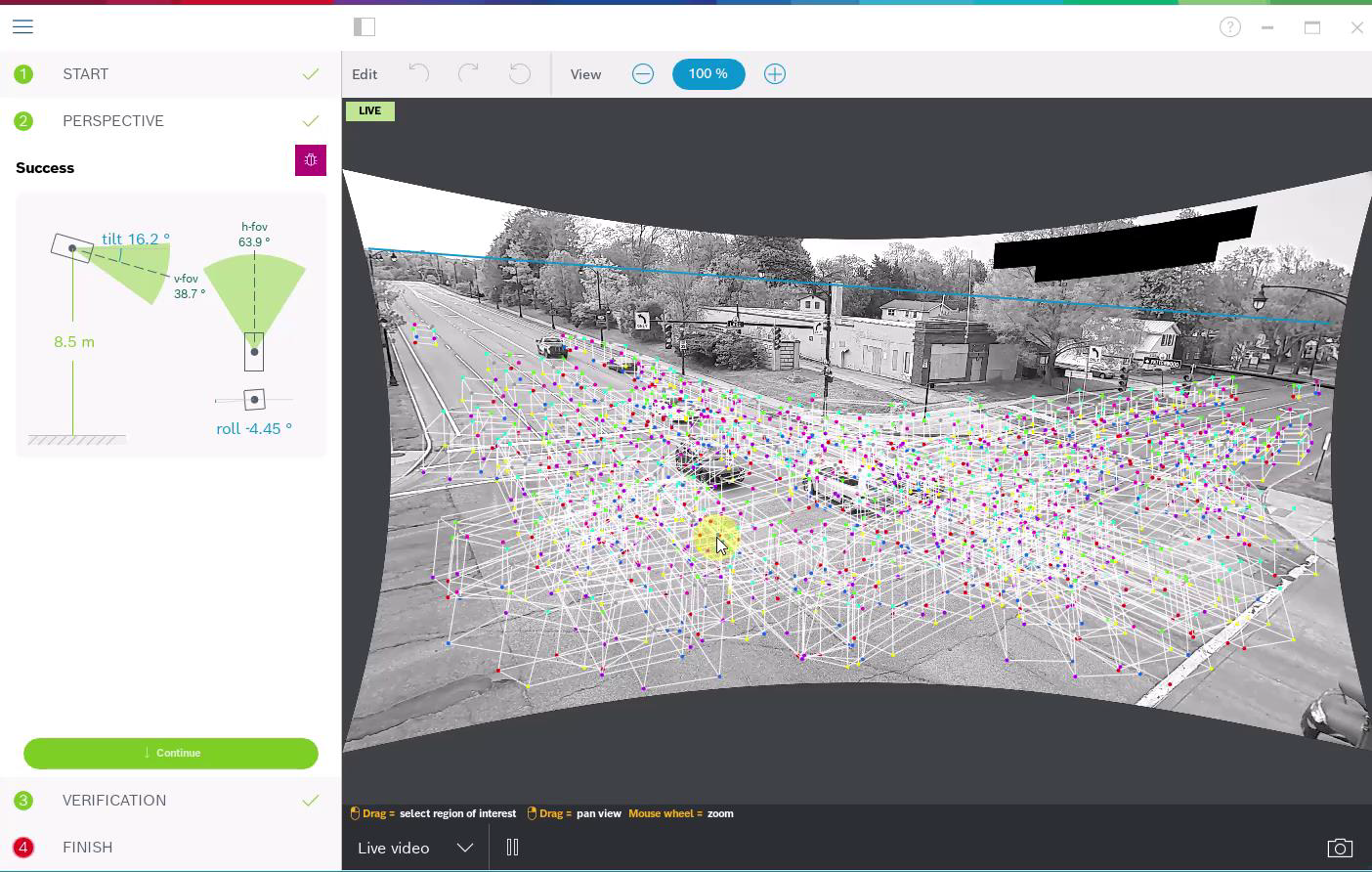 Any camera with Autocalibration continuously analyses the scene for persons / cars, and stores a certain amount of location and size information for them inside the camera itself. It also has inherent knowledge of the camera lens and its characteristics like distortion and focal length. Once Autocalibration is called, all of this information is transferred to the client, here Configuration Manager, and the calibration is inferred from that as soon as enough car samples are collected. There need to be over 25 detections well spread over the image, in case of lack of enough good input a warning will be visible.
