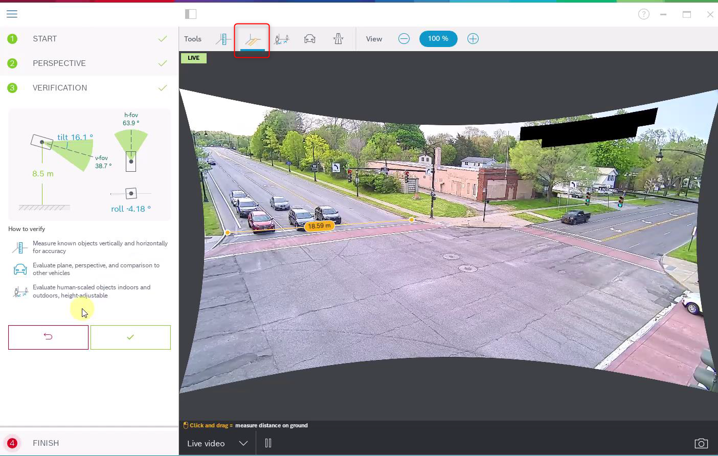 While calibration itself is already finished, we always recommend to verify the results. A toolbar with several verification tools is available abovethe video image. You can measure ground distance, height above ground plane, move a virtual person or car around in the scene, or place a virtual road to see whether the narrowing of the virtual road into the distance corresponds with the real world. Below are examples for ground distance and virtual car verification tools. If calibration is not good enough, then either wait for more car detections preferably at different locations in the image and redo the calibration, or use one of the other calibration methods.