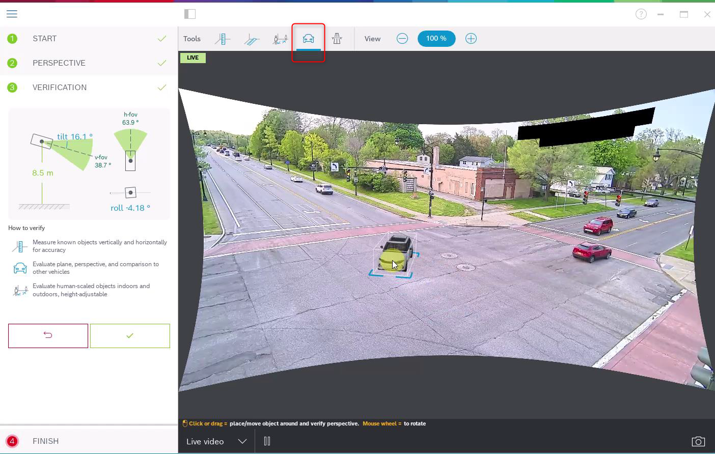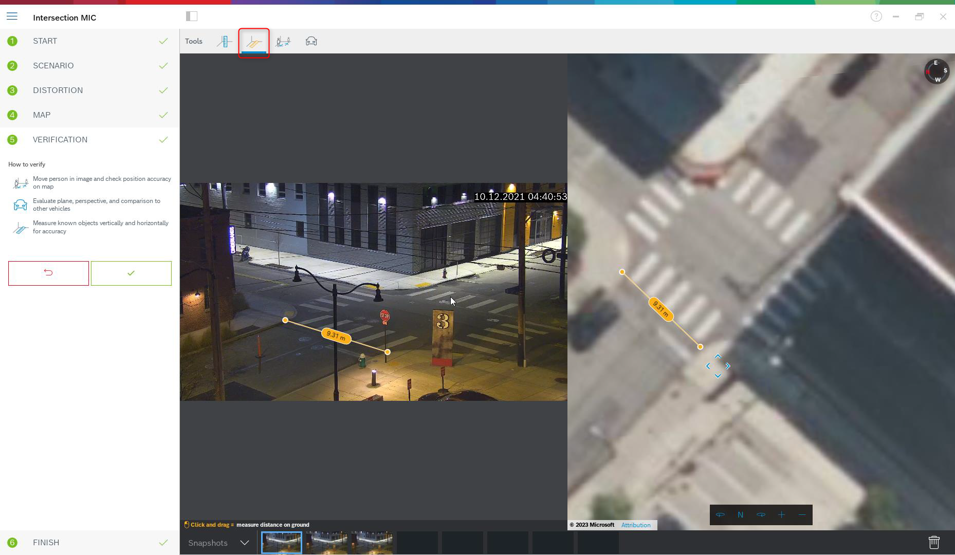 Continue with the verification. You can place a person or car in the camera image and map simultaneously to see whether its size and position is correct.