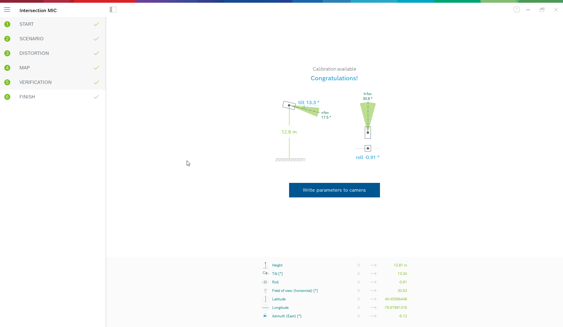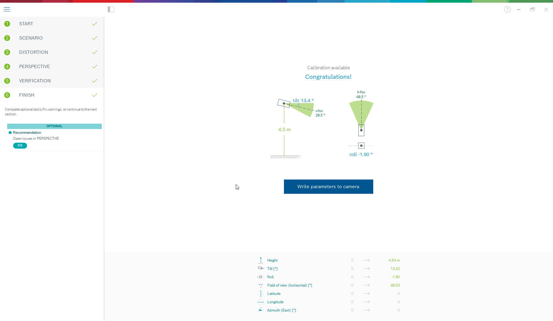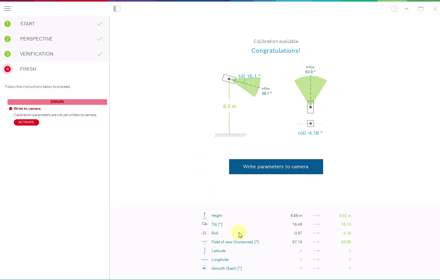 Once you are done, “finish” and write the parameters to the camera. This last page shows a summary of the calibration.