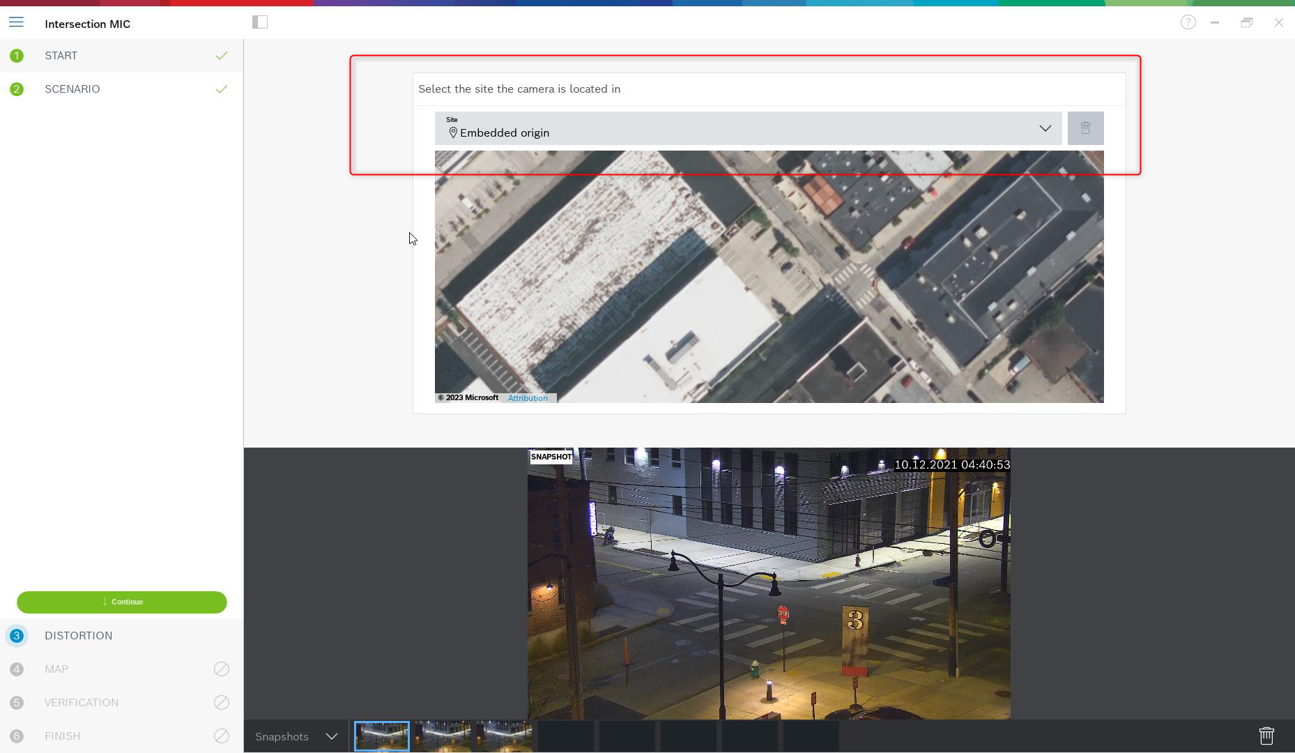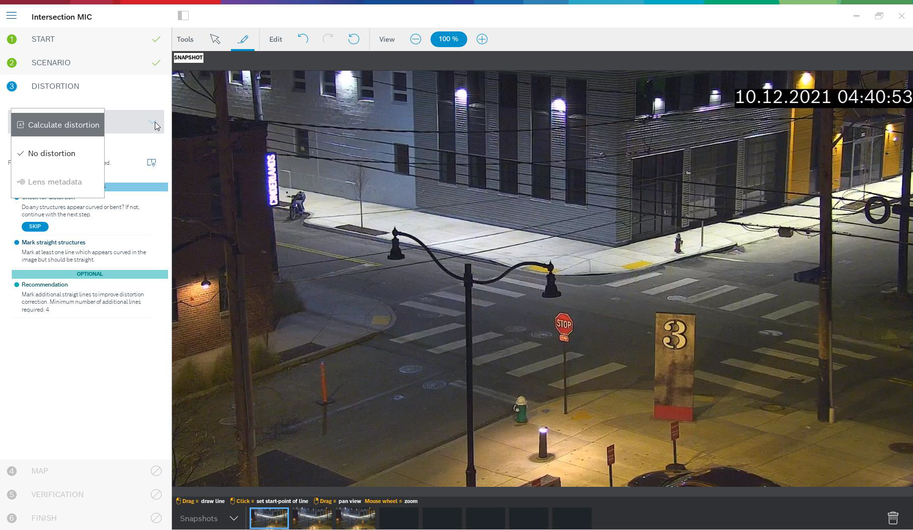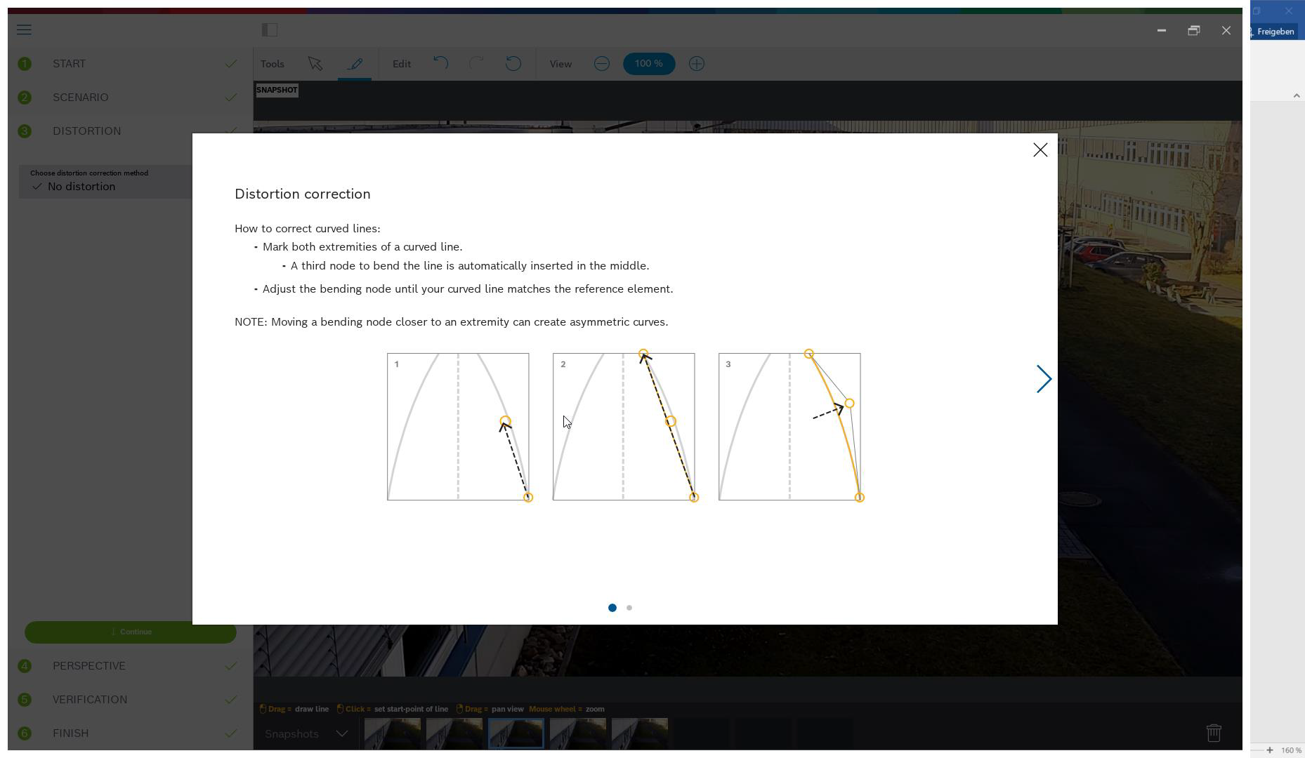 The next step is distortion handling, which is optional and can be skipped. To calculate distortion, mark lines that are straight in the real world, but curved in the image. Ensure the lines follow the curve in the image. In this example, all lines are straight enough so the step will be skipped. You can find more information on distortion in the chapter on assisted calibration in section 0.