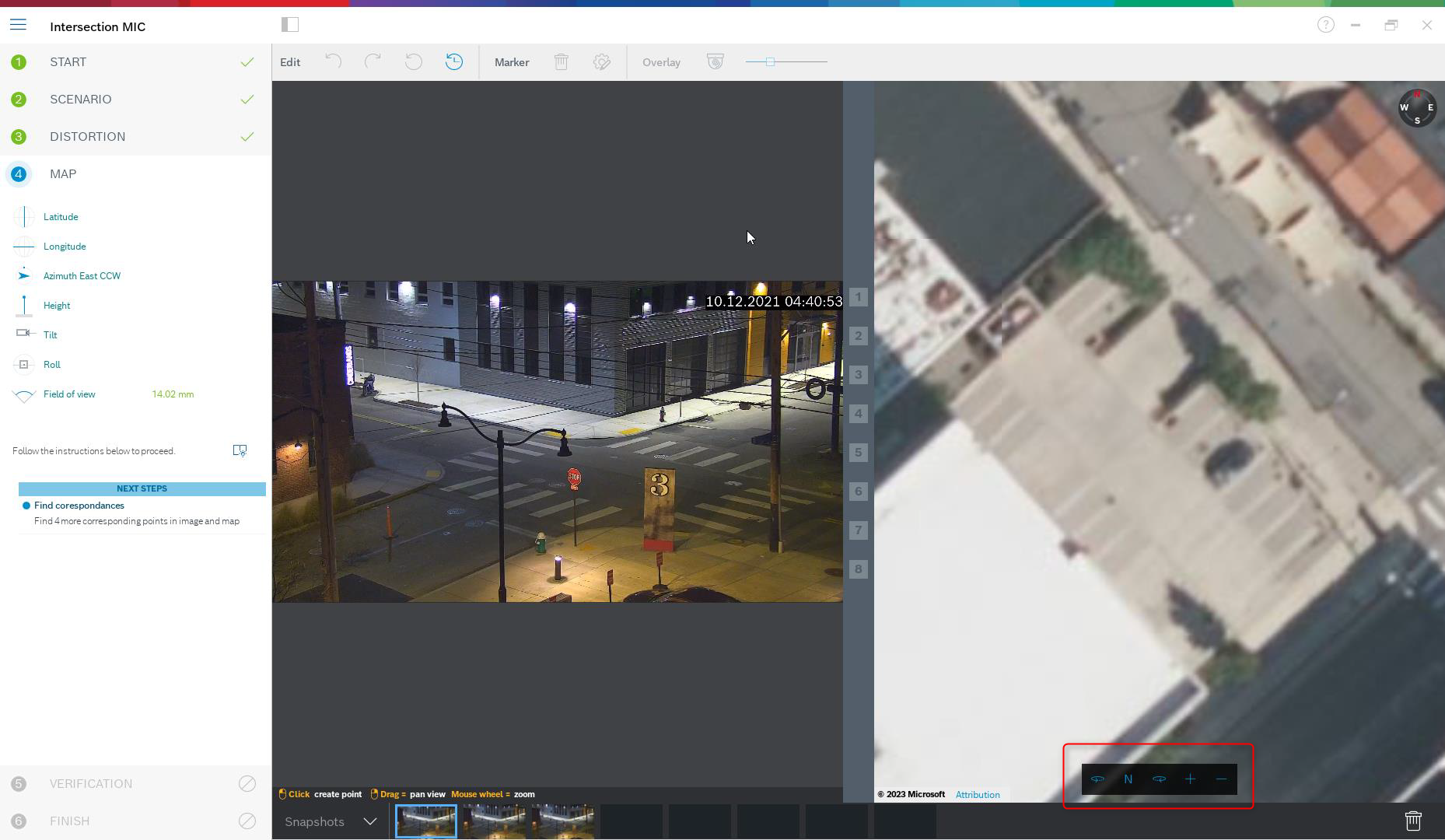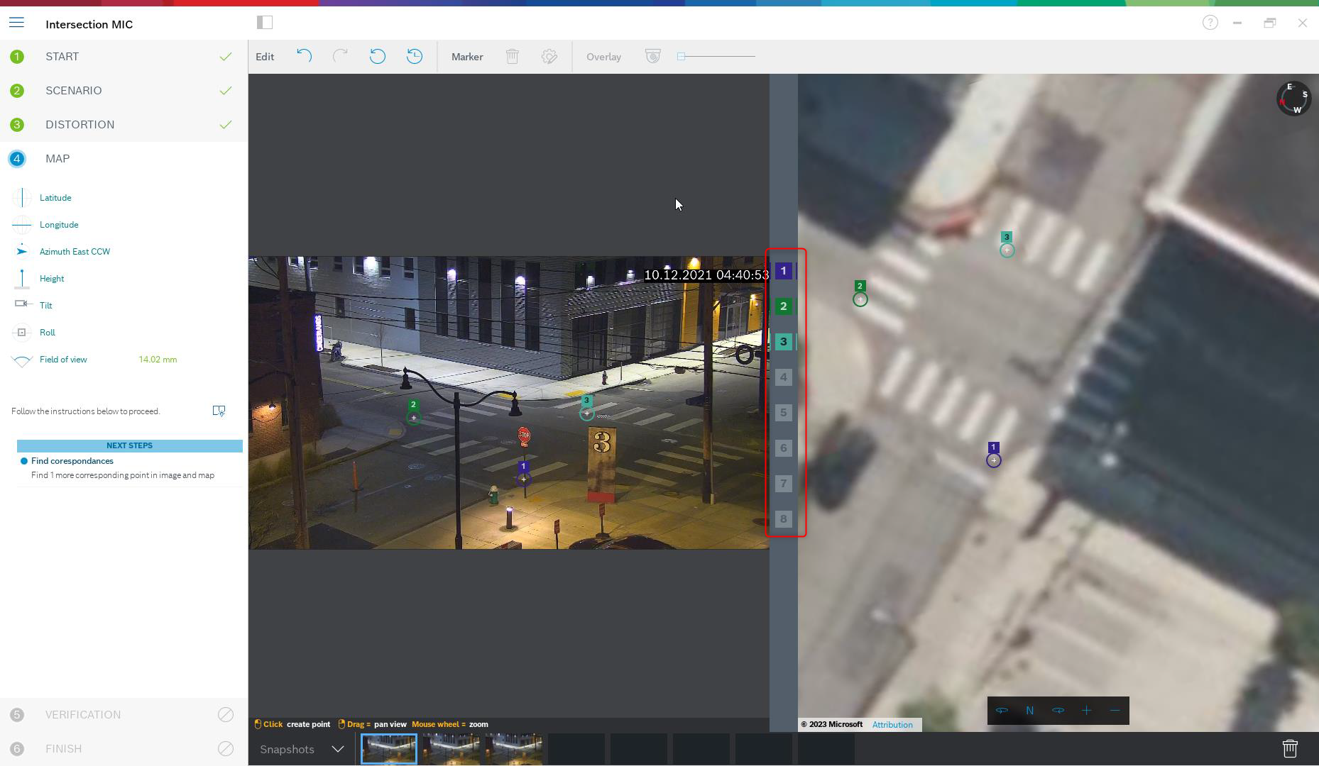 Click on the numbers between the camera image and the map, and drag them into both. These are your markers. Choose corners where possible to place the markers for best accuracy. Ensure that each marker is placed at the same position in camera image and on the map. Ensure to distribute the markers well over your image.