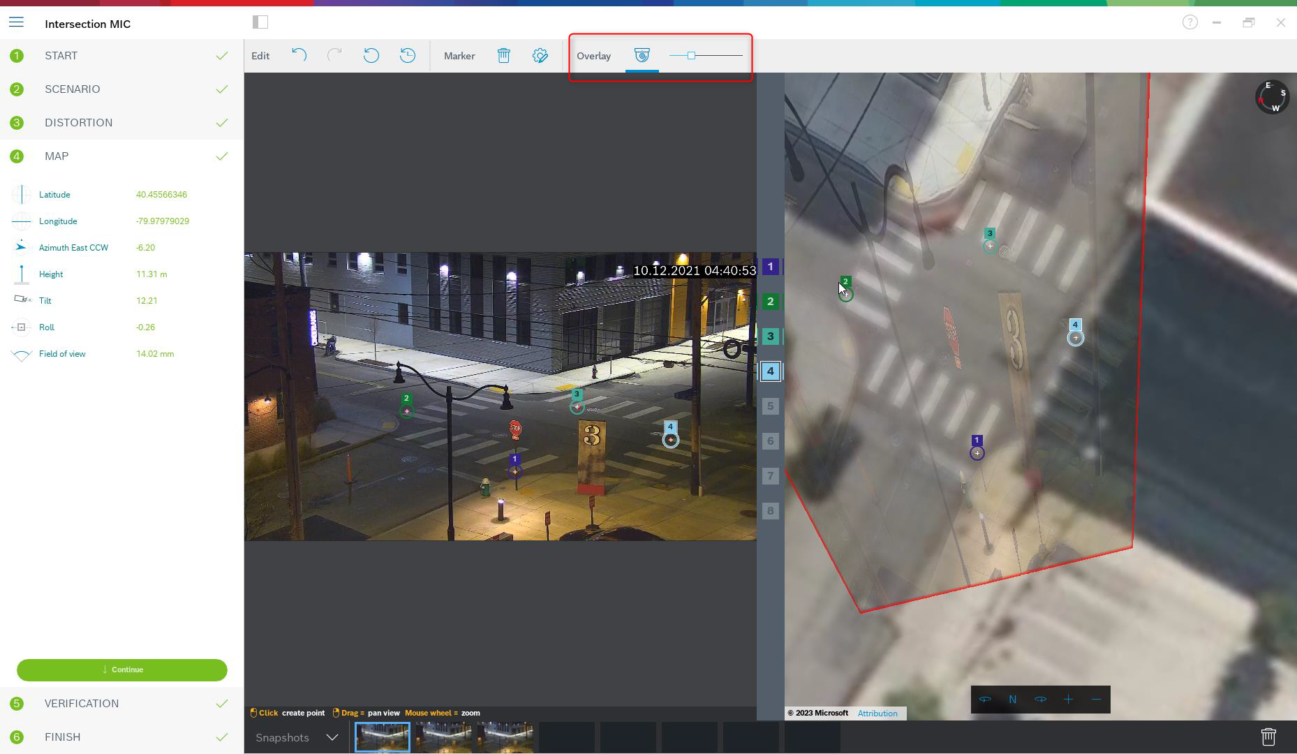 Once enough markers have been placed, the calibration is done automatically and the camera image will be projected onto the map. Use the Overlay slider to make this projection more or less transparent, and see how well it fits onto the map.