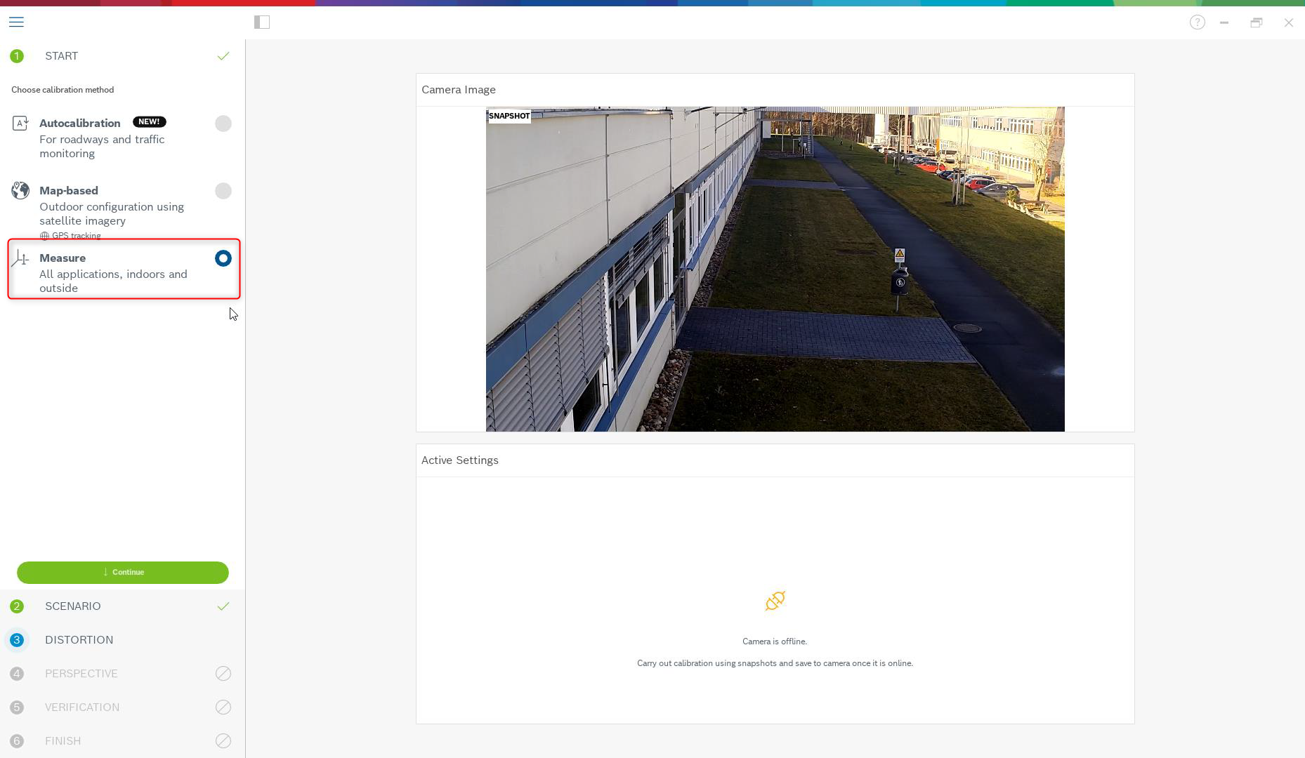 To start the assisted calibration with measuring, open Configuration Manager, select a camera, and go to “General -> Camera Calibration”. Alternatively, use Project Assistant, select a camera and go to “Calibration”. Then, select “Measure” and continue.