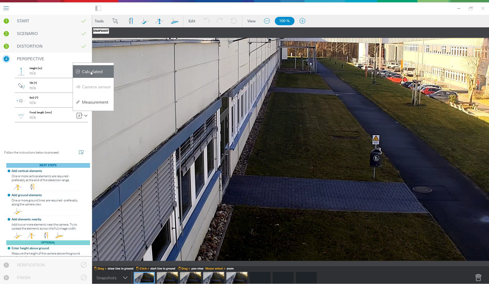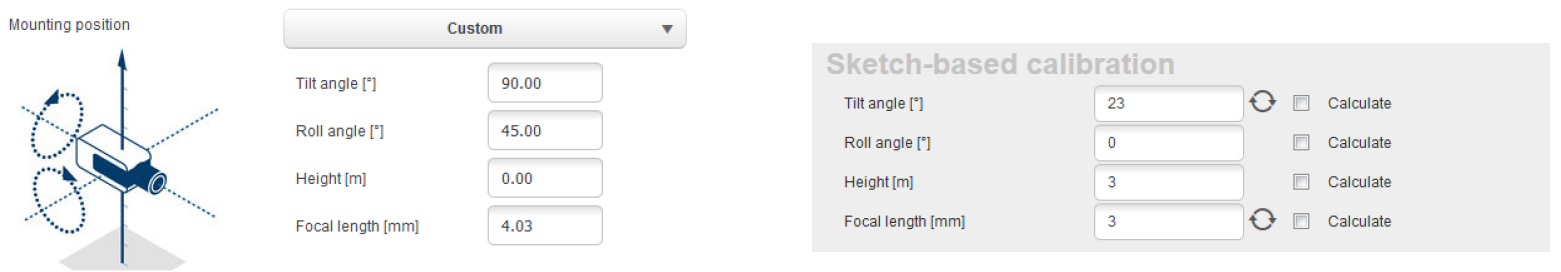 Some cameras have sensors to estimate their tilt and roll angles, or to determine the focal length of the lens. This information is included into the calibration where possible, so that often only the height of the camera needs to be determined.