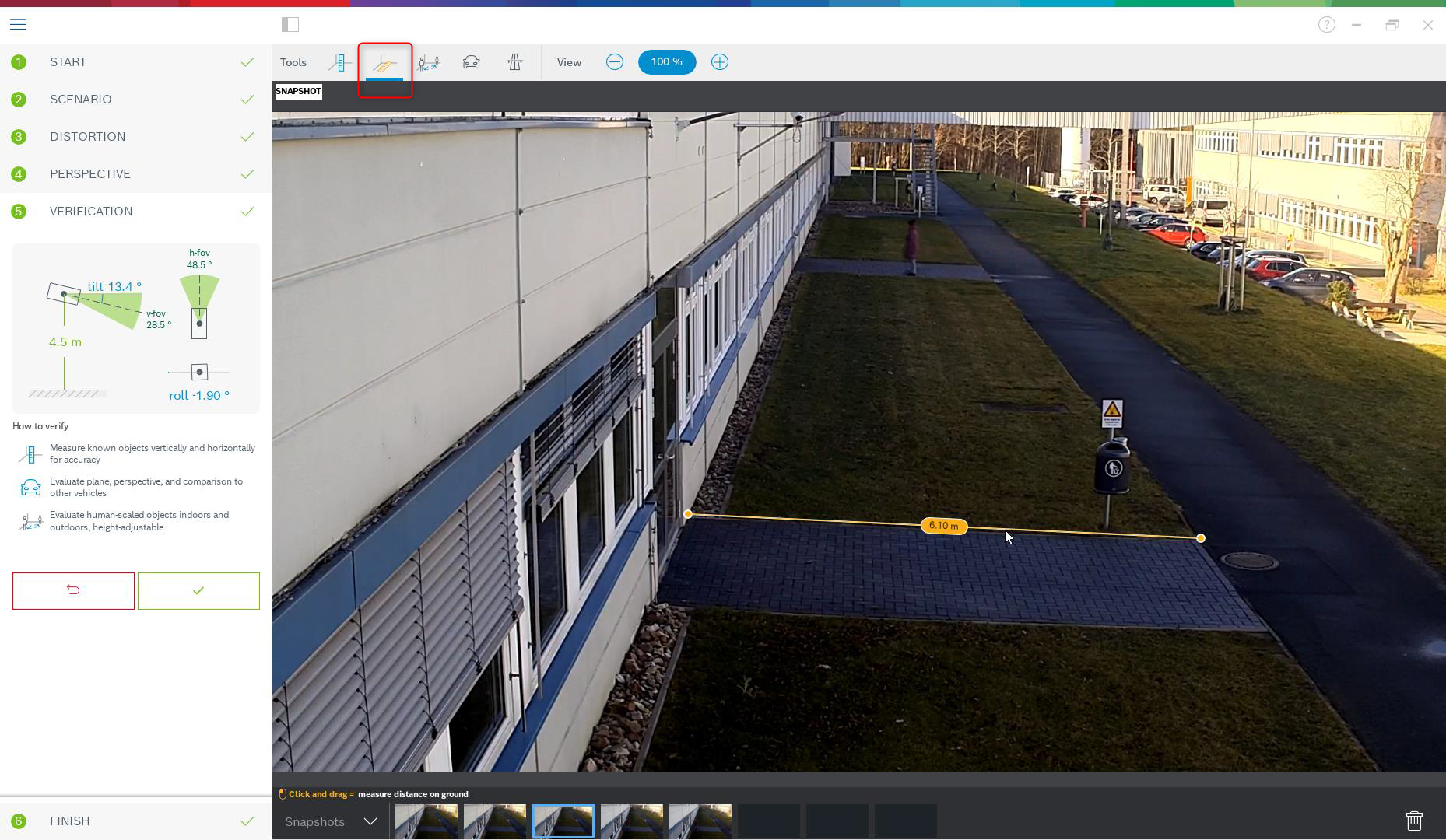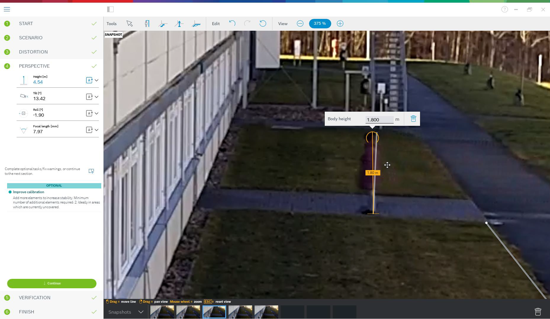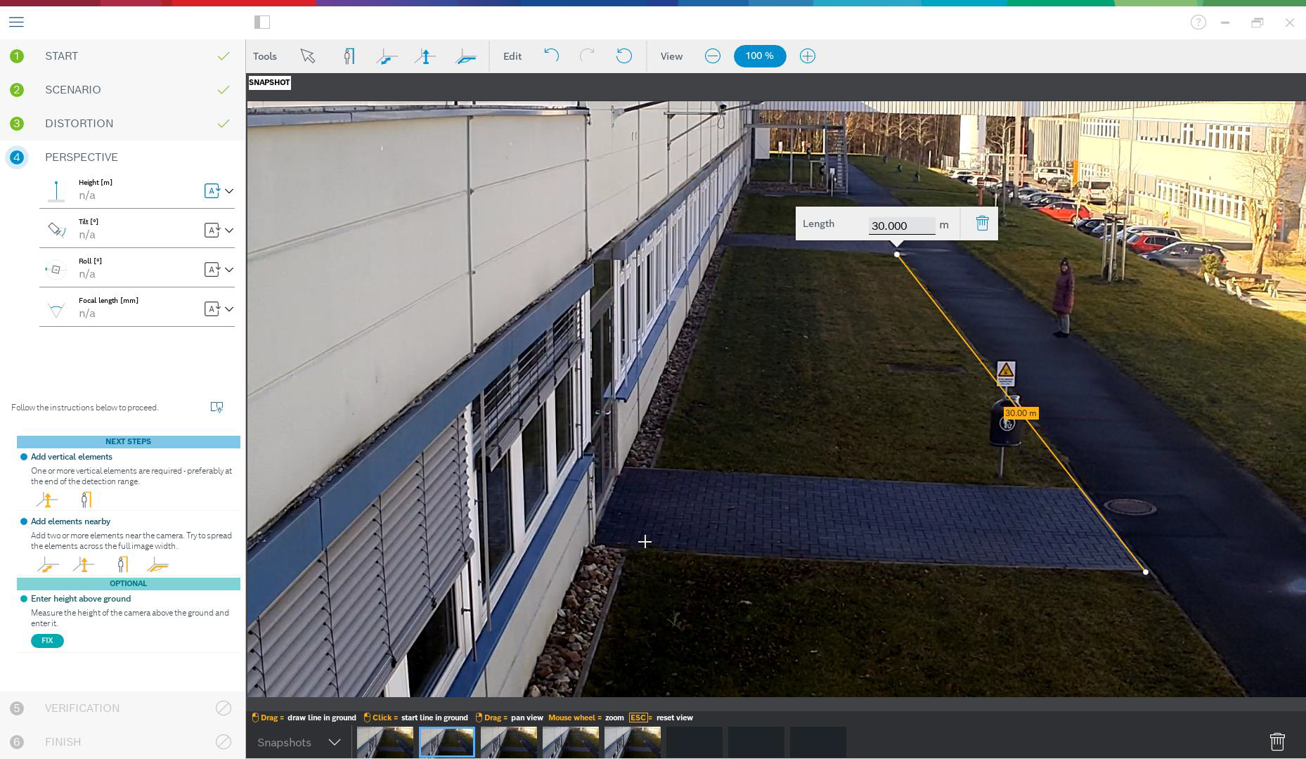 To best prepare this method of calibration, and also the verification, ensure that you have measured at least one distance on the ground looking into the distance, and 2-3 height above ground, for example, by walking through the scene yourself and taking snapshots or a short video of that. Ensure that at least one of the vertical elements is at the furthest position you want to monitor, and that the rest is distributed well over the image, including to the left and right.