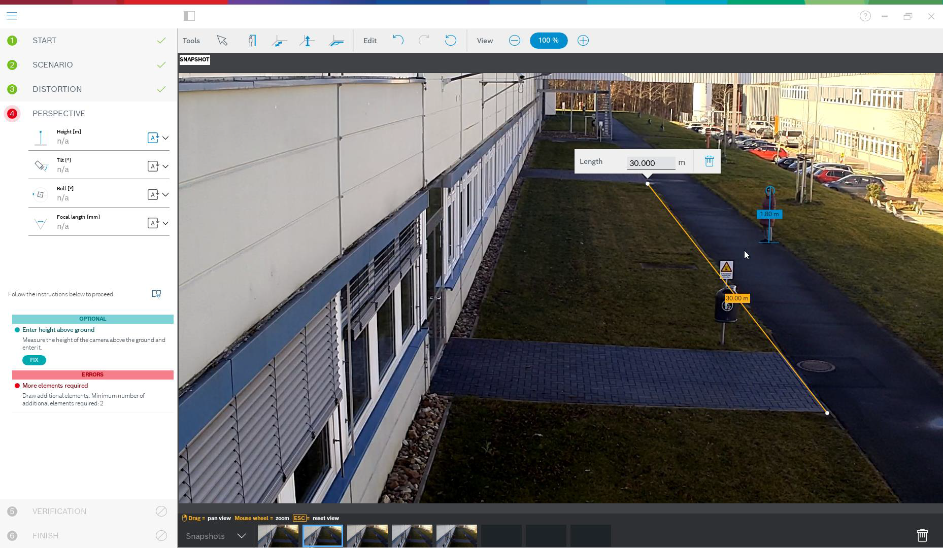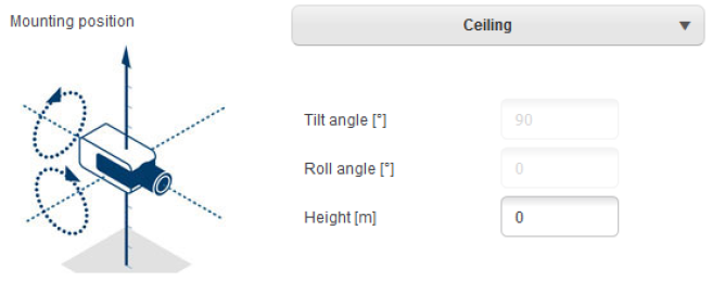 - FLEXIDOME panoramic: The FLEXIDOME panoramic automatically sets the focal length information as the lens is inbuilt. However, it has no internal sensors for measuring angles, and due to the fisheye perspective, sketching of lines will not work either. For most scenarios, the FLEXIDOME camera is either ceiling mounted or a wall mounted, which can be directly selected in the calibration, and thus only the height of the camera above ground needs to be entered manually.