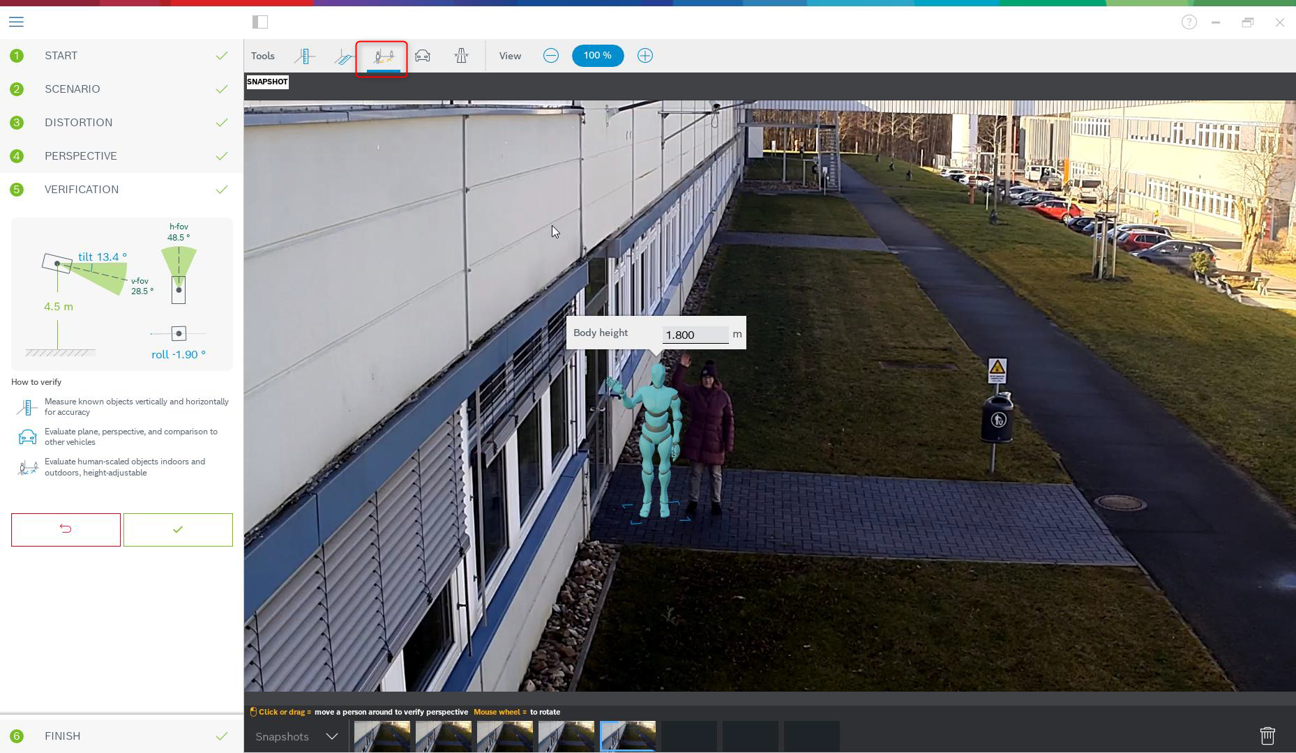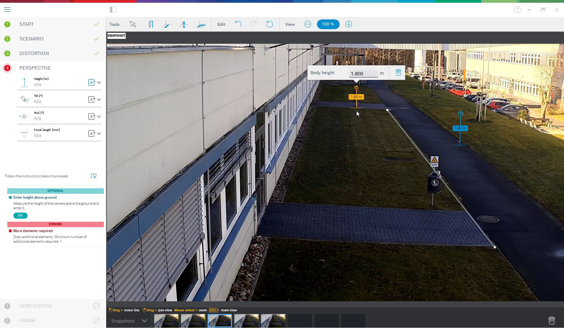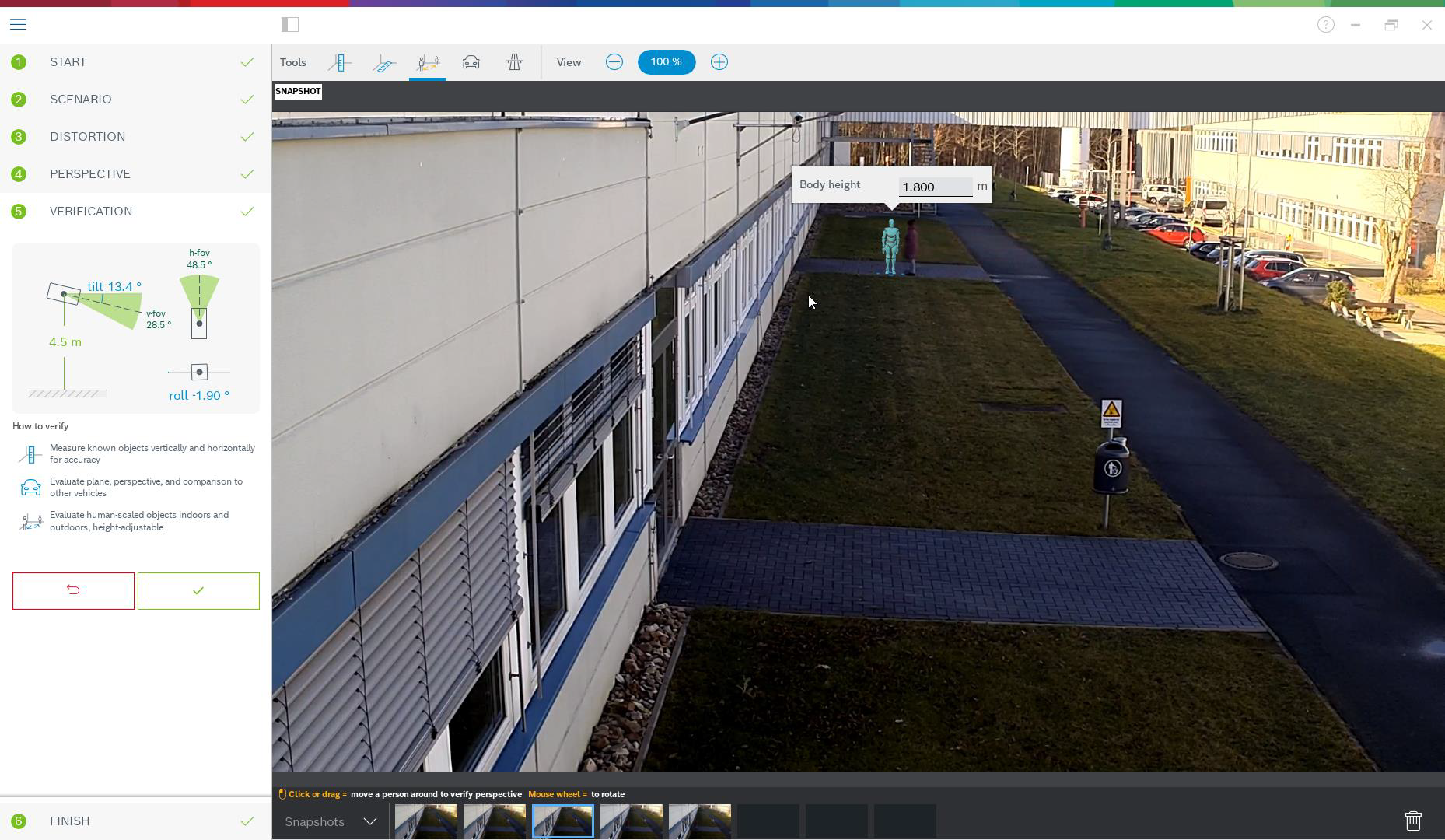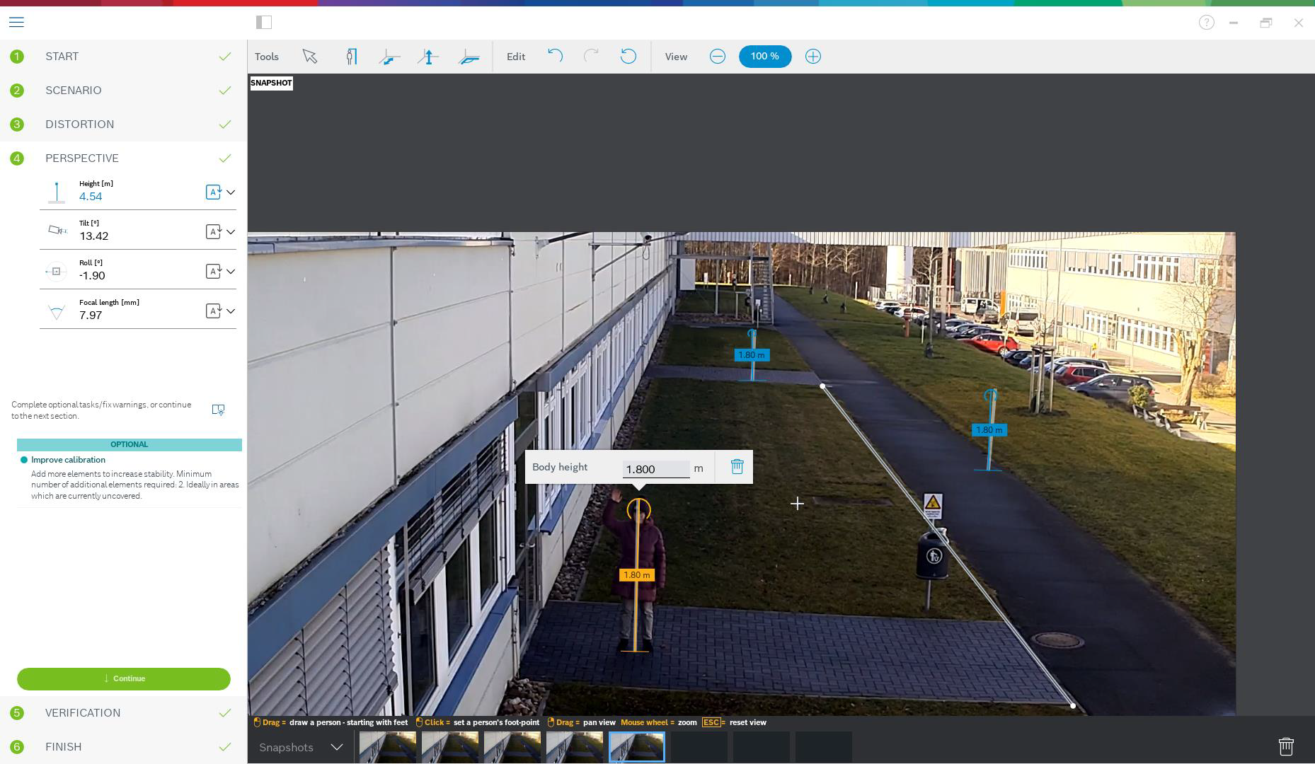 This calibration uses internal sensors from the camera and user input. Alternatively, user input can be given by measuring heights and distances on the ground, for example, by marking a person walking through the scene. The calibration tool guides users through all necessary steps. It supports calibration from recordings, allowing a person to walk through the scene and be used as a known reference in the calibration process afterwards.