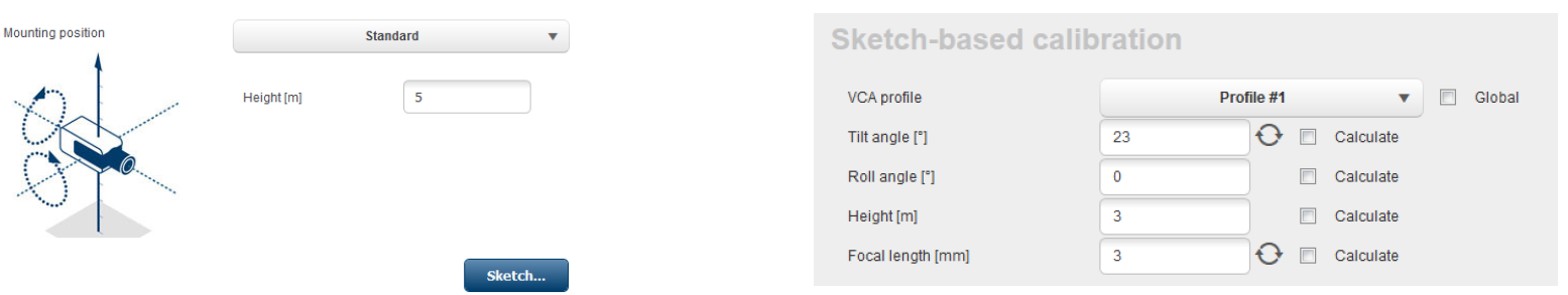 - AUTODOME / MIC: Calibration can be done once for the camera by choosing “standard” mounting position and entering the height of the camera above ground. The assumption is that the AUTODOME / MICs are mounted perfectly straight. Any deviation from that cannot be modeled in the global calibration. For all pan-tilt-zoom positions of the camera, it will then automatically deduce the correct calibration and field of view itself. In case of prepositions with video analytics, the calibration can be fully adjusted to compensate for field of views on different ground planes, non-horizontal ground planes or inaccuracies for large zoom factors via the sketch tool. These calibrations are only active if a preposition is activated, but not when the camera just sweeps across the preposition while on a non-preposition tour or manual steering. In that case, the global calibration – if available – will stay active.