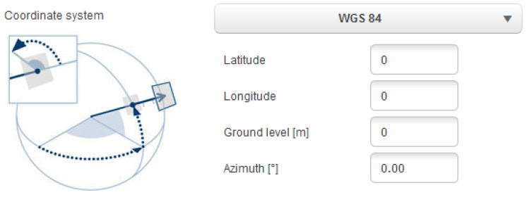 WGS 84, the most used GPS coordinate system. It describes the position of the camera on the earth in the spherical latitude and longitude coordinates. In addition, the ground level above sea level can be set.