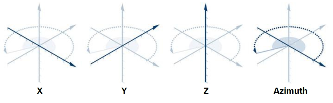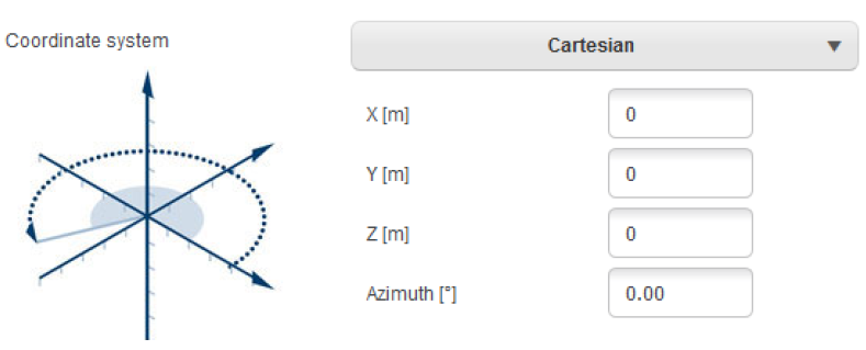 For both coordinate systems, the direction into which the camera looks is described by the azimuth angle. The azimuth is defined as zero in the east or along the X-axis and a positive azimuth angle means that the camera is turned counter clockwise when viewed from above, resulting in north at 90° or along the Y-axis, west at 180° and south at 270°.