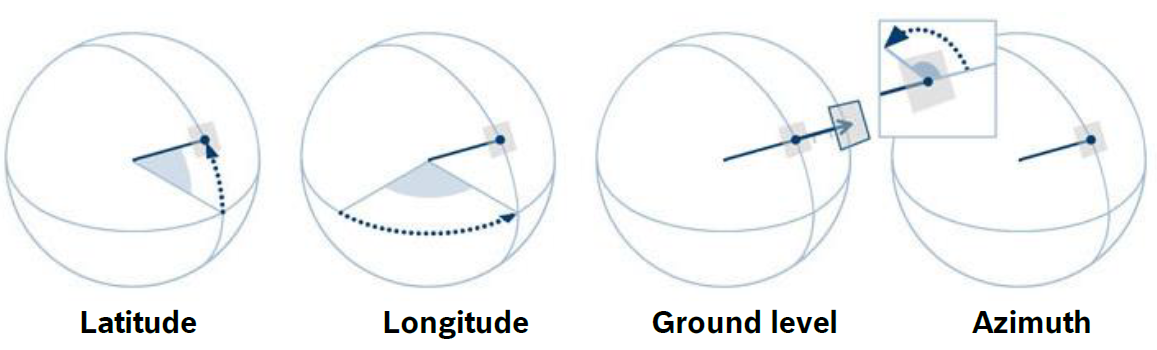 Tilt angle: The angle between the horizontal plane and the camera. A tilt angle of 0° means that the camera is mounted parallel to the ground; a tilt angle of 90° means that the camera is mounted top-down in a birds eye view perspective. The flatter the tilt angle is set, the less accurate the geolocation of the tracked objects will be. Estimates are no longer possible when you have reached 0°.