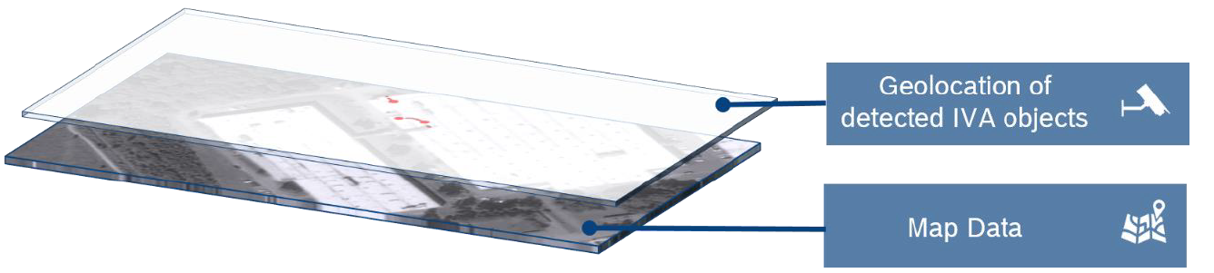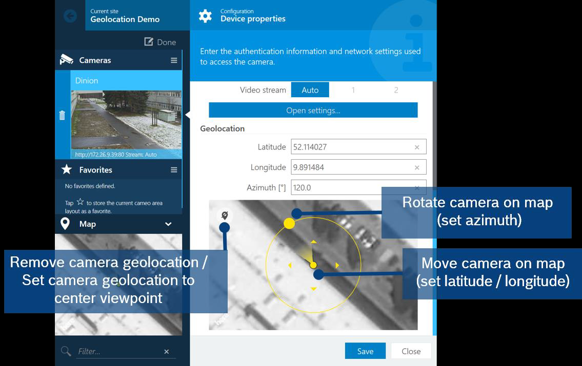 Starting with version 2.1, the Video Security Client offers a map view for geolocated cameras with WGS 84. It provides a map view including the locations of the cameras and the object tracked by Intelligent Video Analytics, Essential Video Analytics or Intelligent Tracking, as well as an easy way to configure the cameras geolocation.