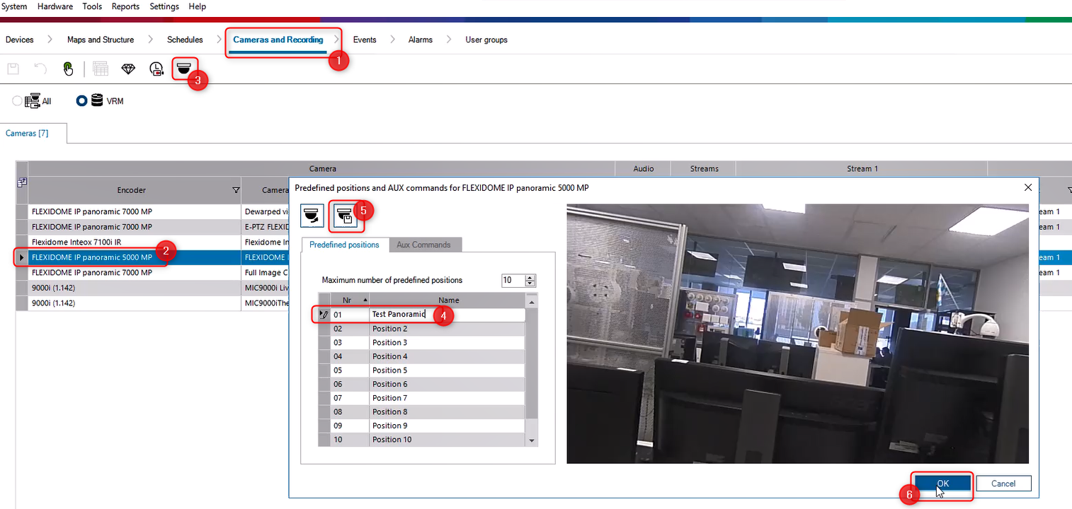 Type in the name of the Predefined position (4) and save it (5) and click OK