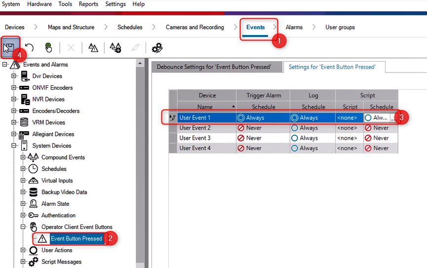 Here you should switch the Event to Always in order for it to be displayed in the Alarms tab. Do not forget to save these changes.