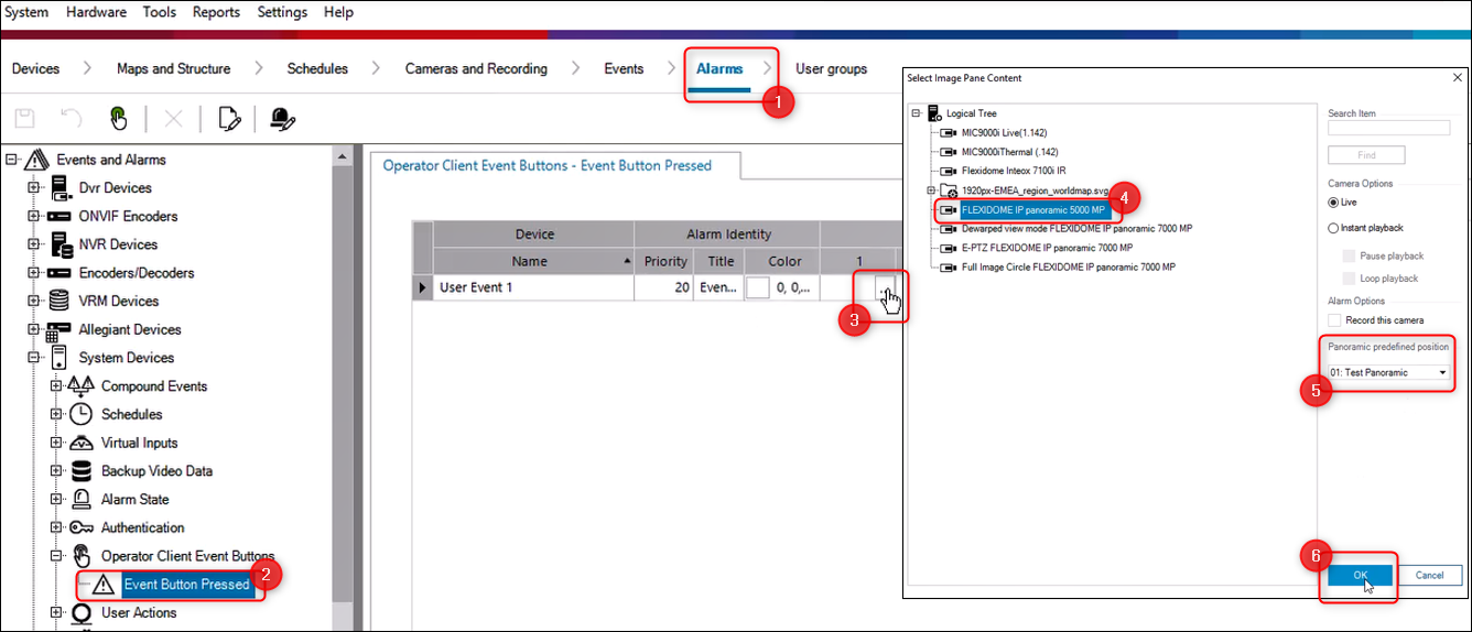 3. Now, go to the Alarms tab and click on the three dots button under the Alarm Image Panes section > Select the FLEXIDOME IP panoramic 5000 camera and switch to the preposition that you have created earlier (in this case "01: Test Panoramic") from the drop-down menu, under the Panoramic predefined position option > click OK