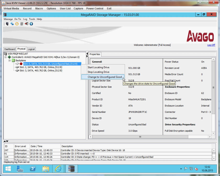 Right click on the ''Unconfigured Bad'' drive and select ''Change to Unconfigured Good''.