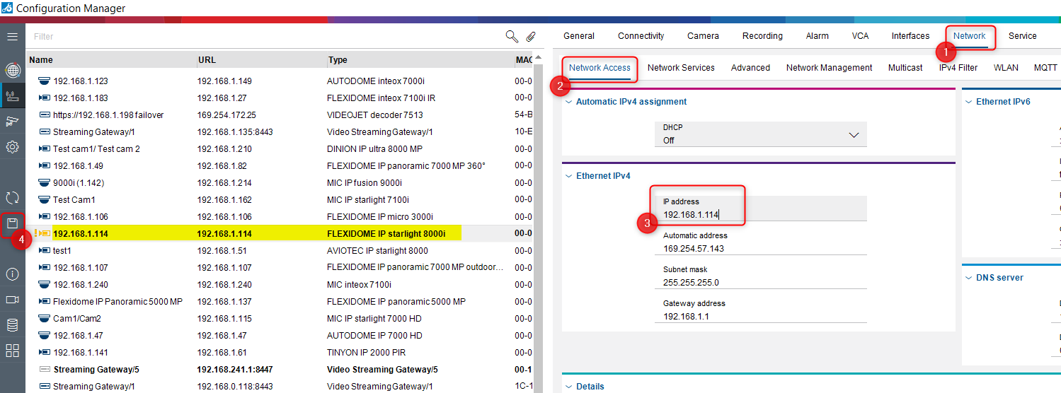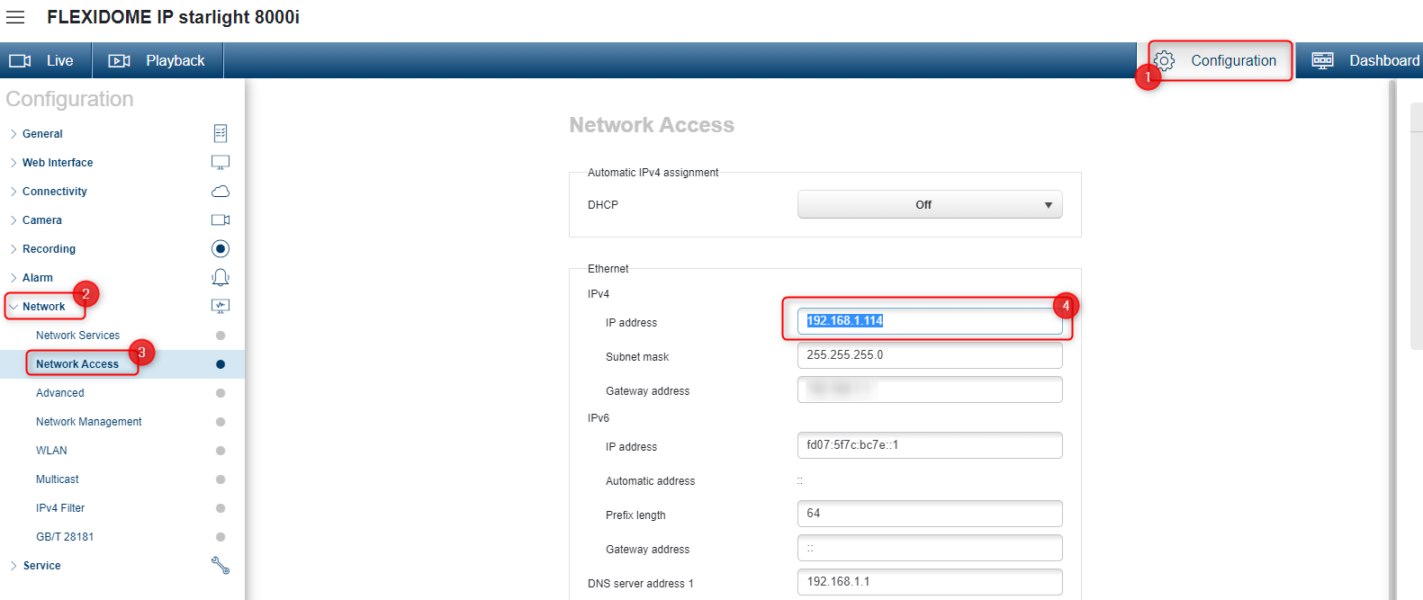 3. Go to Network (1) > select Network Access (2) > change the IP address of the camera under Ethernet IPv4 section (3) > Save your changes (4)