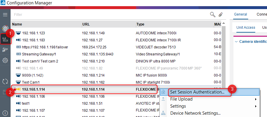1. Open Configuration Manager and select the "Network scan" menu (1) > right click on the camera you want to change the IP address of it (2) > Set session Authentication (3)
