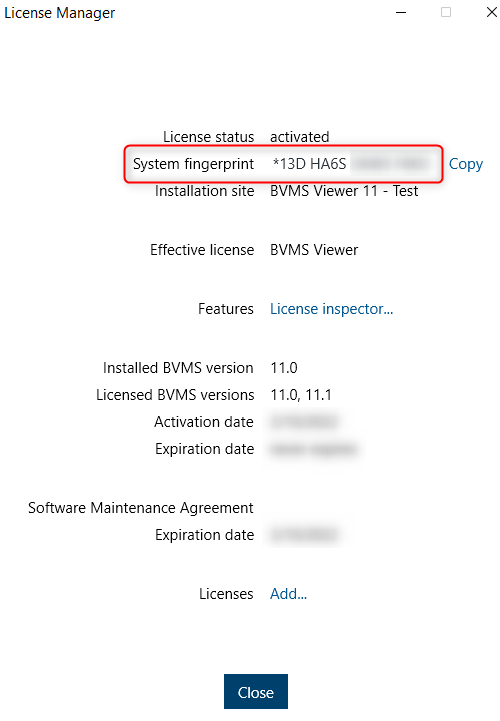 The System Fingerprint can also be found in License Manager, once the BVMS 11.x was installed and the license activated.