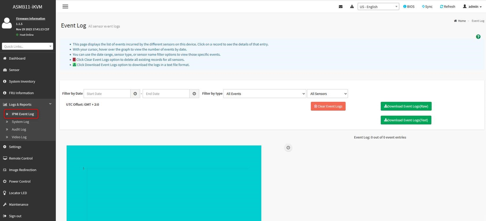 The Logs & Reports > IPMI Event Log page displays the list of events incurred by the different sensors on the device. Click on a record to see the details of that entry. Hover over the graph to view the number of events by date. You can use date range, sensory type, or sensor name filter options to view specific events.