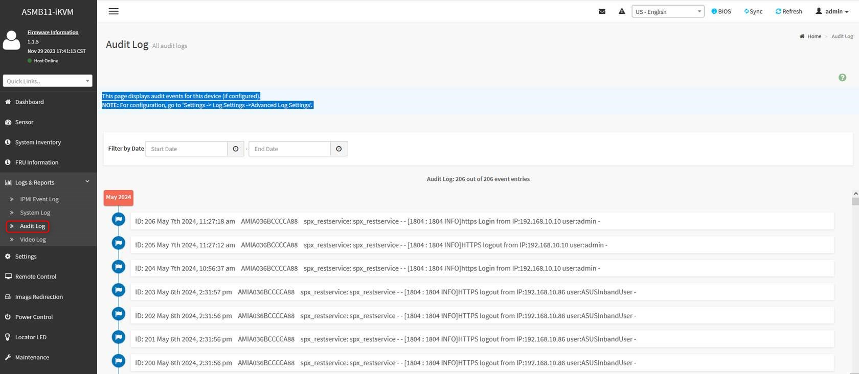 While it is possible to export some logging from the BMC interface, it is recommended by ASUS to use the ASUS Inband Tool for this purpose instead.