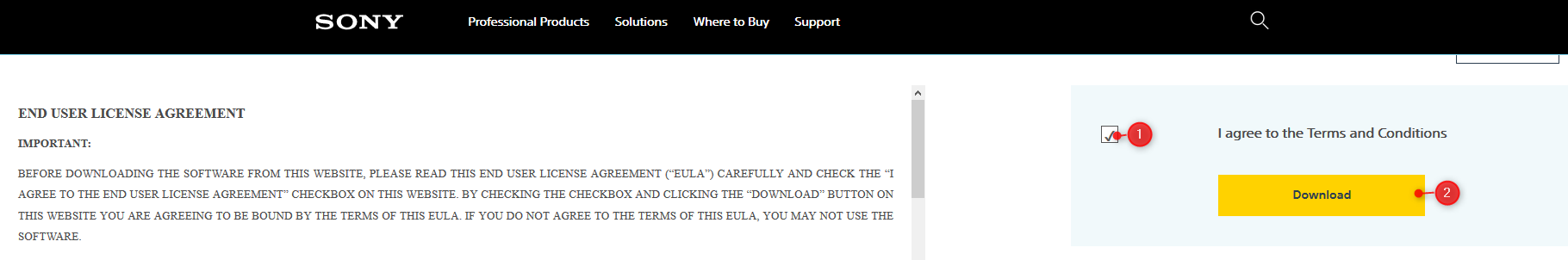 Click the download button under the Link column > check the box near "Terms and Conditions" > click the "Download" button