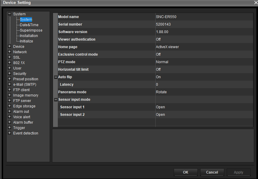 The System overview of the SONY camera can be found in "Device Setting(T)" menu. Right click on the camera > select Device Setting(T) > The System overview will be displayed.