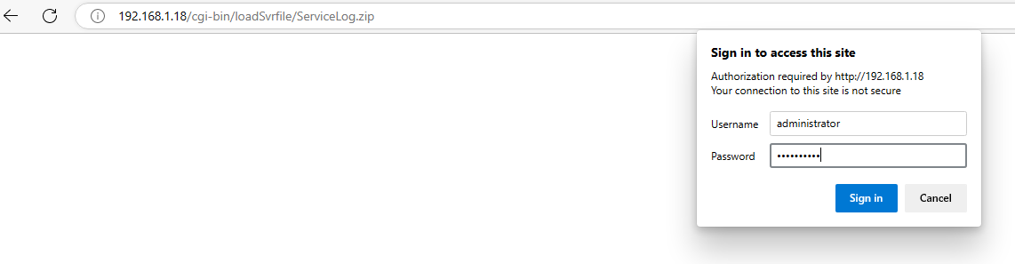 - In address bar enter: http://<ip-adress>/cgi-bin/loadSvrfile/ServiceLog.zip