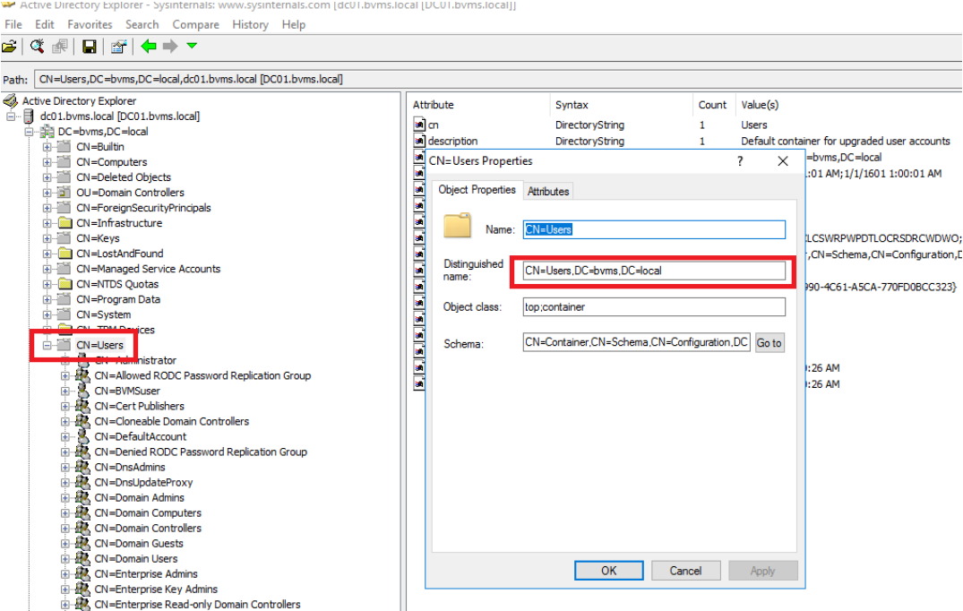 Select the organizational unit which contains the user-group which you want BVMS to associate with. Open its properties (right-click) and copy the Distinguished Name (DN) of the organizational unit.