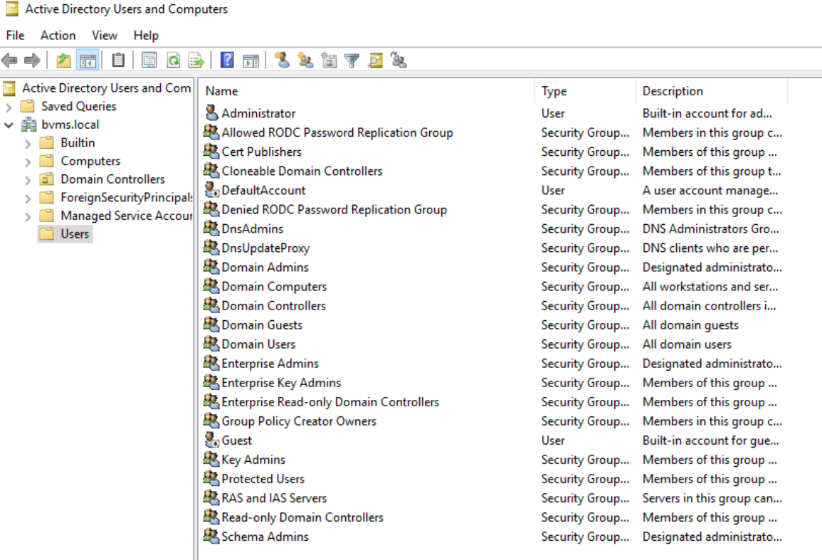 The Active Directory Users and Computers overview on the domain controller looks like shown below (this is the default configuration, no additional users or groups are added).