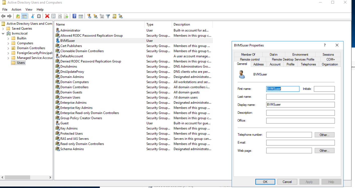 It is recommended to create a specific BVMS usergroup (the example below uses a group within the "Users" organizational unit: "BVMSgroup"). A user was added to the BVMSgroup, as shown below.
