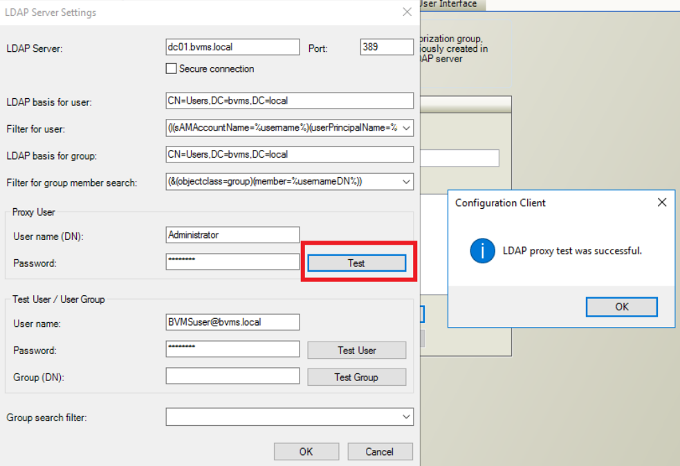 The Test button within the Proxy User section tests the connection to the LDAP server. Check the username, password, LDAP Server (IP address or DNS name) settings if a connection errors appears.