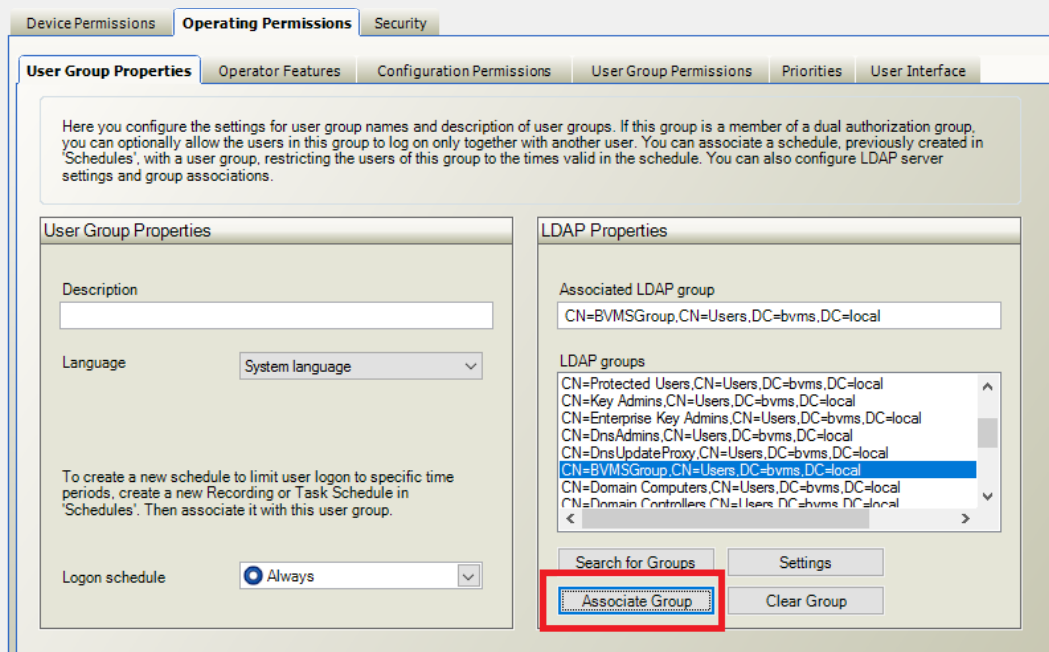 Once the groups are listed, the BVMS user group needs to be associated with the LDAP group.