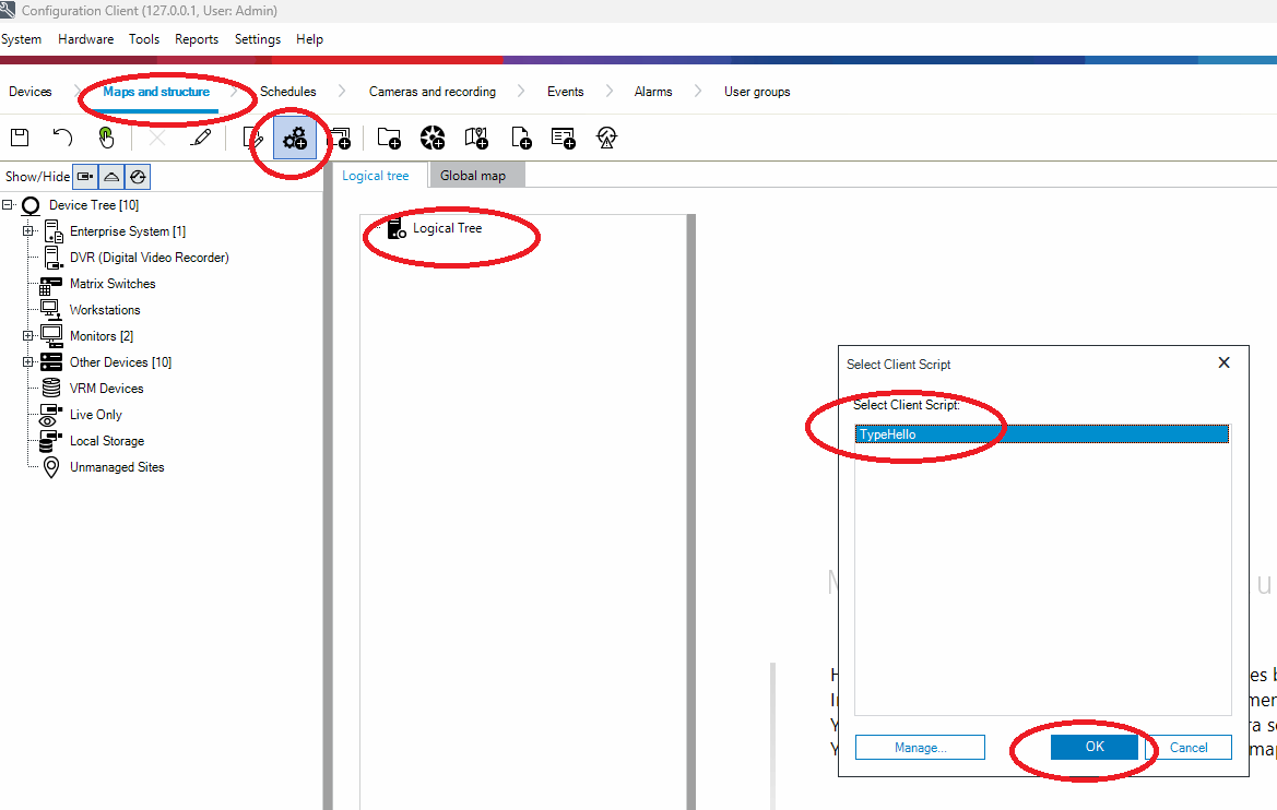 - Add the client scriplet to the logical tree. Click on Maps and structure, Logical Tree, Add Command Script, then select the scriplet name and click OK.