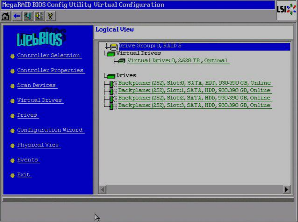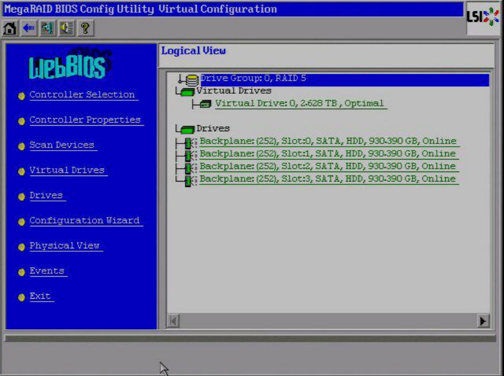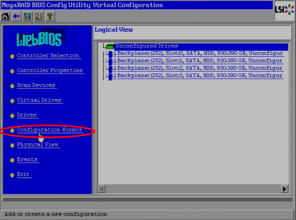 2) The main LSI “WEBBIOS” page should load. From this page you should see all new replacement drives as “Unconfigured”.