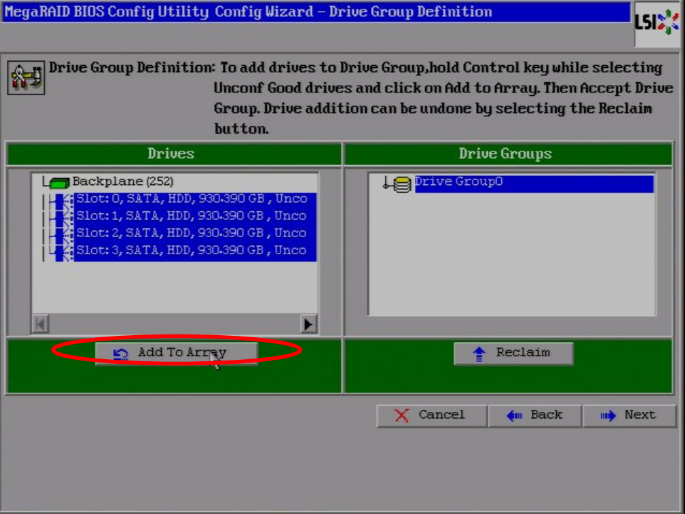 6) After selecting “Add To Array” all drives should appear on the right side of the menu under “Drive Group0”.