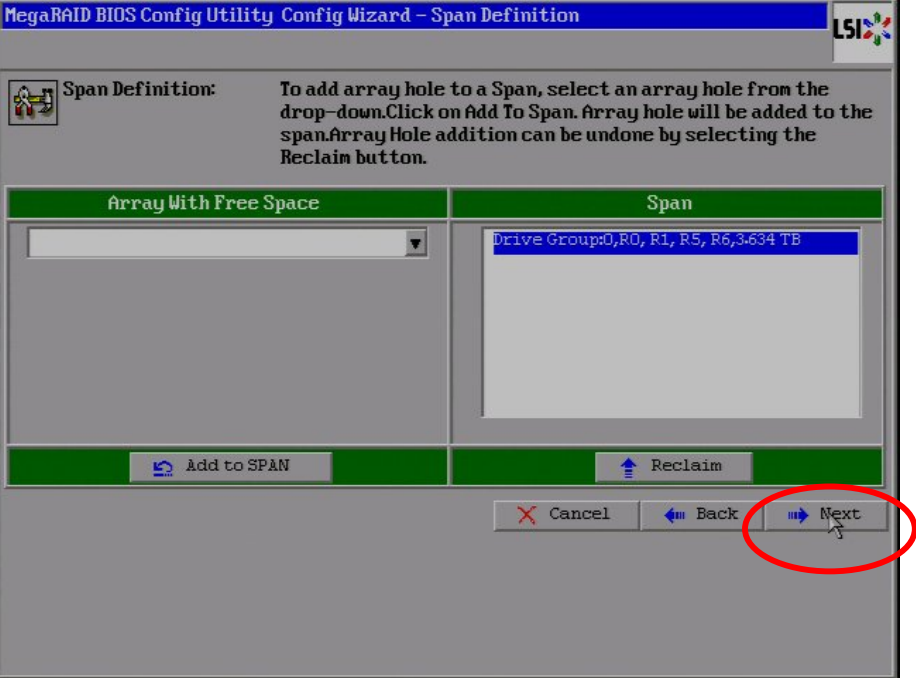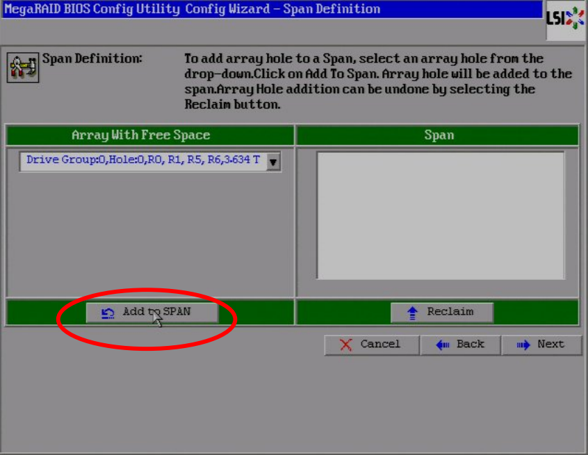 8) The “Array With Free Space” menu on the left should show “Drive Group0” available. Select “Add to Span”.