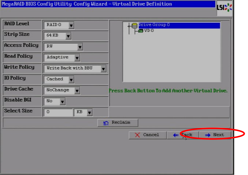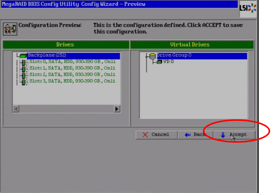 12) You should see “VD 0”” in the “Virtual Drive Definition” menu page select “Accept”.