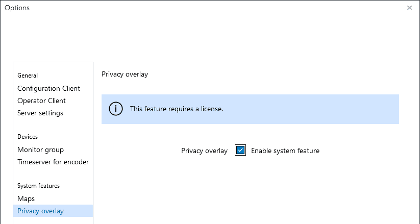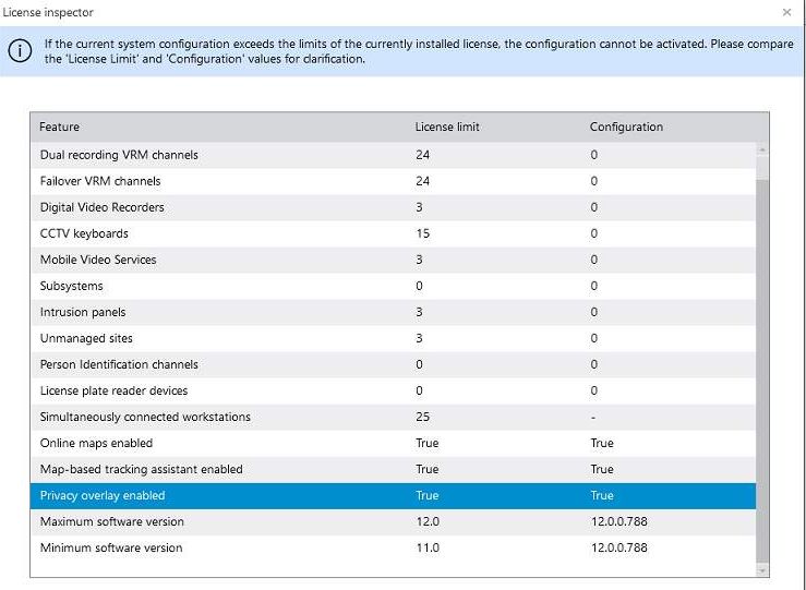 1. Make sure that the feature license is available in License inspector of BVMS (Privacy overlay enabled = “TRUE”)
