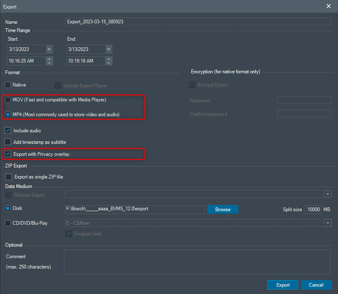 If a user has privacy overlay enabled for a camera, it is not possible to export video footage without privacy overlay. If it is not enabled, it is possible to choose in the export dialog.