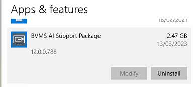 The installed BVMS AI package and the BVMS installation must have exactly the same version number (.788 is only an example and not the newest version)
