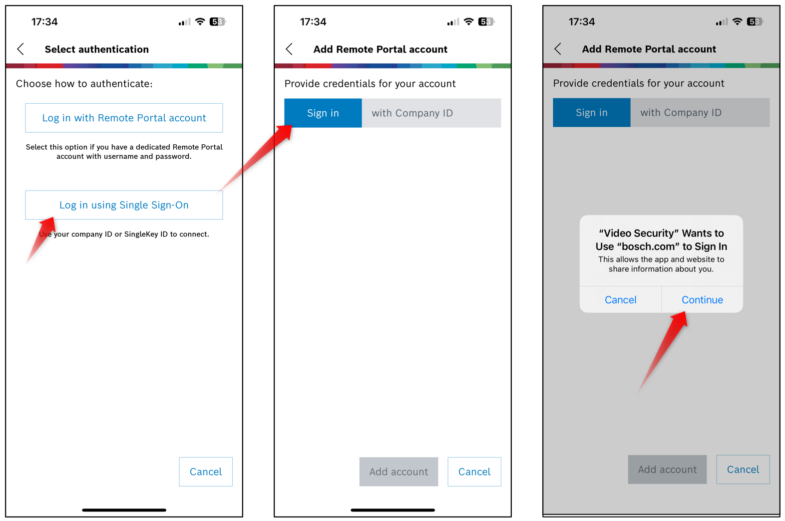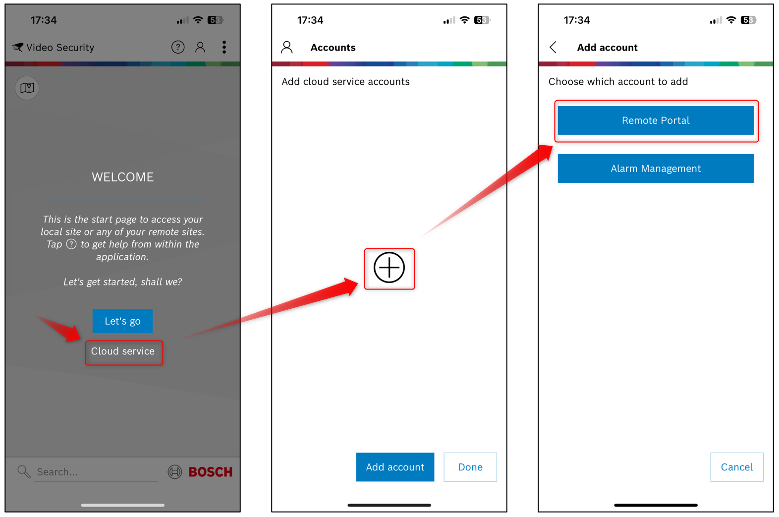 Enter your Remote Portal credentials. If you have no account yet, go to remote.boschsecurity.com to create one