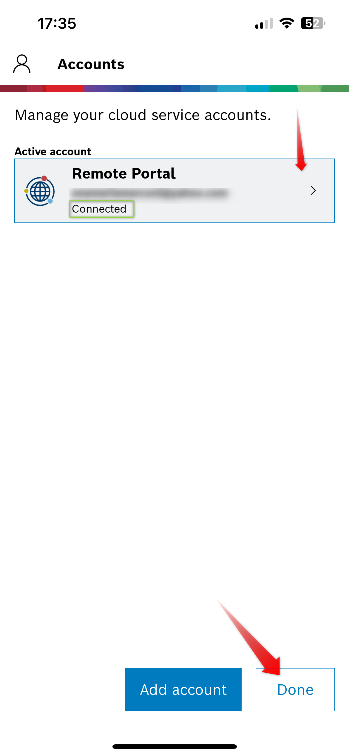 • Press on the Cloud service link > click Add account button > Select Remote Portal > Select Log in using Single Sign-On > click Sign in > Continue > Complete your credentials > Continue> Add account > You will be connected to the Remote Portal > Done