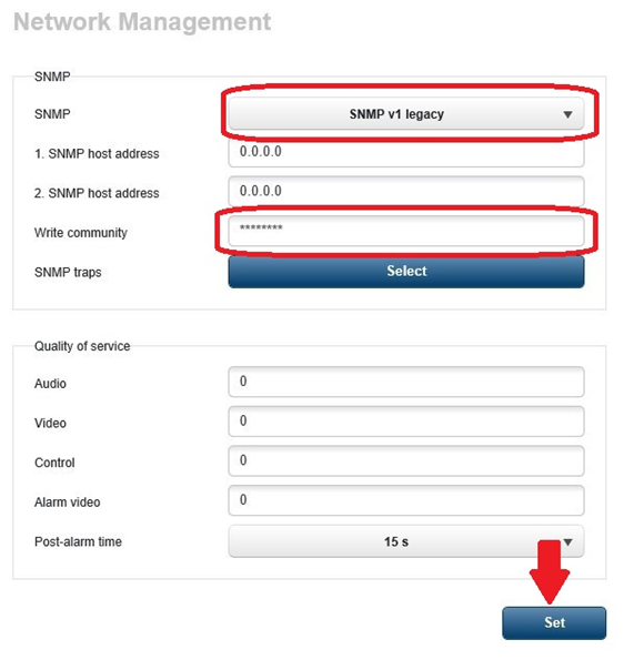- Example to change the community string for SNMP write access to the Bosch default Community name of public: