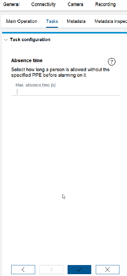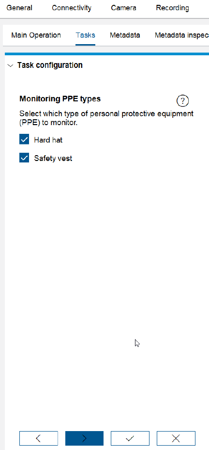 The default task is PPE monitoring, which will alarm if either safety vest or hard hat are missing. Note that all tasks from IVA Pro Buildings are available as well and can be set by adding new tasks via the + Button.