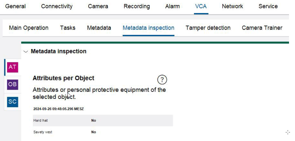In order to see whether IVA Pro PPE detects safety vest or hard hat on a person, go to VCA -> Metadata Inspection and select a person. It may take up to 3 seconds to display the results.