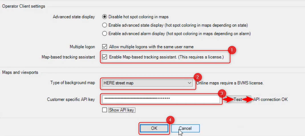 - Enter the customer specific API received in the email with the license order and click the Test button. The API connection status should be OK.