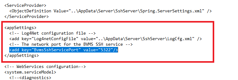 Open the configuration file and find the section below. Edit the value of the BvmsSshServicePort (the port should be unused) and restart the system.