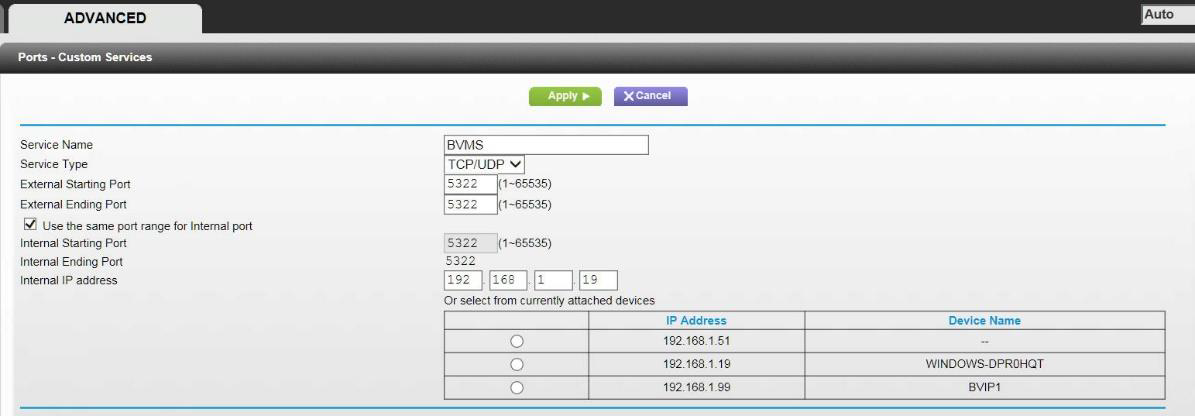 The primary configuration step is to configure one (1) port forwarding for the BVMS Central Server to utilize port 5322 for both internal and external connections. This is the only port mapping entry that needs to be made for the entire system.